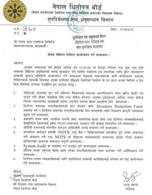यसैगरी, लगानीकर्ता हित संरक्षण कोष स्थापना गर्ने कार्यको प्रगति समेत बोर्डले मागेको छ । साथै, कर्मचारी सञ्चय कोष, नागरिक लगानी कोष, सामाजिक सुरक्षा कोष तथा धितोपत्र व्यवसायीहरुलाई सेक्युरिटिज डिलर प्रवेशका कामको प्रगतिको सम्बन्धमा पाि बोर्डले नेप्सेलाई ७ दिनभित्र सिफारिस गर्नको लागि माग गरेको छ ।