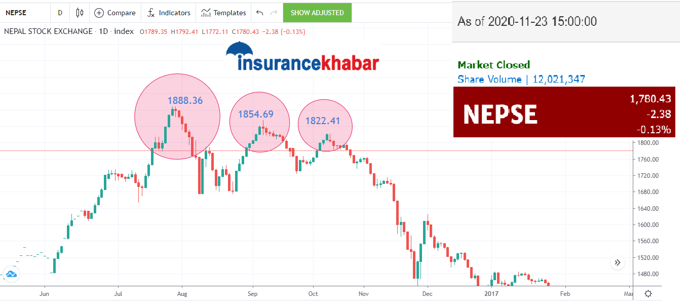 घटिरहेको बजारले फेरी माथिल्लो दिशा समातेकोमा ६ सेप्टेम्बर २०१६मा पुन १८५४ दशमलव ६९ को उच्च विन्दु समात्दै पुन बजारले घट्न सुरु भएको थियो र त्यस्पस्चात घटिरहेको बजारले फेरी माथिल्लो दिशा समात्दै १८२२ दशमलव ४१ को उच्च विन्दु समात्दै बजारले बियरिस ट्रेण्ड समातेको थियो ।