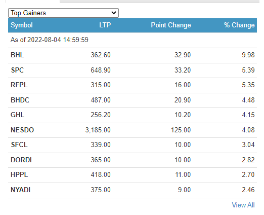 आज सबैभन्दा धेरै बलेफी हाइड्रोपावर कम्पनीका लगानीकर्ताले कमाएका छन् । कम्पनीका लगानीकर्ताले ९ दशमलव ९८ प्रतिशतका दरले कमाएका छन् । सामलिङ पावर कम्पनीका लगानीकर्ताले ५ दशमलव ३९ प्रतिशतका दरले कमाएका छन् । रिभर फल्स पावर कम्पनीका लगानीकर्ताले ५ दशमलव ३५ प्रतिशतका दरले कमाएका छन् । विन्ध्यवासी हाइड्रोपावर कम्पनीका लगानीकर्ताले ४ प्रतिशतका दरले कमाएका छन् ।