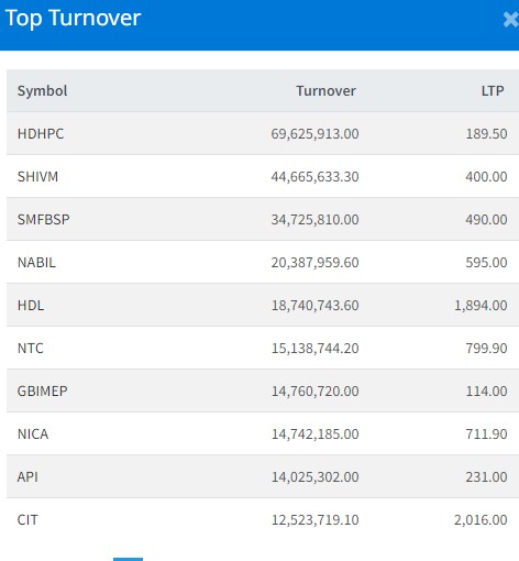 आज सबैभन्दा धेरै हिमाल दोलखा हाइड्रोपावरको शेयर कारोबार भएको छ । आज कम्पनीको ६ करोड ९६ लाख रुपैयाँको शेयर कारोबार भएको छ । शिवम् सिमेन्टको ४ करोड ४६ लाख रुपैयाँको शेयर कारोबार भएको छ । स्वाभिमान लघुवित्तको ३ करोड ४७ लाख रुपैयाँ संस्थापक शेयर कारोबार भएको छ । नविल बैंकको २ करोडमाथि शेयर कारोबार भएको छ ।
