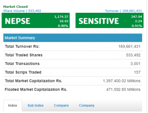 नेप्से परिसूचक १०.४३ अंकले बढेर ११७४ को विन्दुमा, दुबै बीमा उपसुचकमा बृद्धि