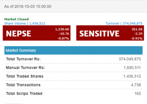 नेप्से परिसूचक साताकोे चौथौ दिन १० दशमलव ७६ अङ्कले घटेर १२३० दशमलव ६० अङ्कमा बन्द भएको छ । कारोबार रकम ३७ करोड ४० लाख पुगेको छ ।
