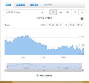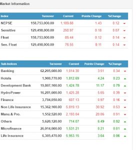 काठमाडौ:नेप्से परिसूचक साताको पहिलो दिन आईतबार १ दशमलव ४३ अङ्कले घटेर ११८९ दशमलव ८८ अङ्कमा बन्द भएको छ। कारोबार रकम १६ करोड ७० लाख पुगेको छ। आज सबै भन्दा धेरै उत्पादनमूलक क्षेत्रको शेयर मूल्यमा गिरावट आएको छ। आज उत्पादनमूलक क्षेत्रका परिसूचक सबै भन्दा धेरै ० दशमलव ९१ प्रतिशतले घटेको छ । आज सबै भन्दा धेरै अन्य क्षेत्रमा वृद्धि भएको छ।