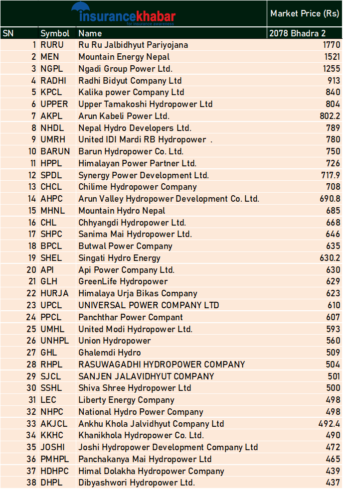 उक्त दिन ३८ हाइड्रोपावर कम्पनीको शेयर कारोबार भएको थियो । ३८ कम्पनीमध्ये रुरु जलविद्युत् कम्पनीको शेयरमूल्य सर्वाधिक थियो । यो कम्पनीको शेयरमूल्य प्रतिकित्ता १ हजार ७७० रुपैयाँ थियो।