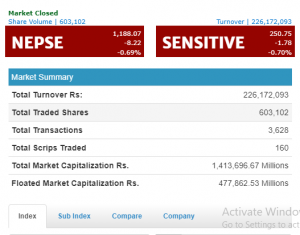 नेप्से परिसूचक साताको दोस्रो दिन सोमबार ८ दशमलव २२ अङ्कले घटेर ११८८ दशमलव ०७ अङ्कमा बन्द भएको छ । कारोबार रकम २२ करोड ६१ लाख पुगेको छ ।आज सबैभन्दा धेरै हाईड्रोपावर क्षेत्रको शेयर मूल्यमा गिरावट आएको छ । आज हाईड्रोपावर क्षेत्रको परिसूचक सबै भन्दा धेरै १ दशमलव ६९ प्रतिशतले घटेको छ । आज सबै भन्दा धेरैउत्पादनमूलक क्षेत्रमा वृद्धि भएको छ । उत्पादनमूलक क्षेत्रको परिसूचक ० दशमलव ५१ प्रतिशतले वृद्धि भएको छ । आज उत्पादमूलक क्षेत्रमा मात्र वृद्धि देखीएको छ ।