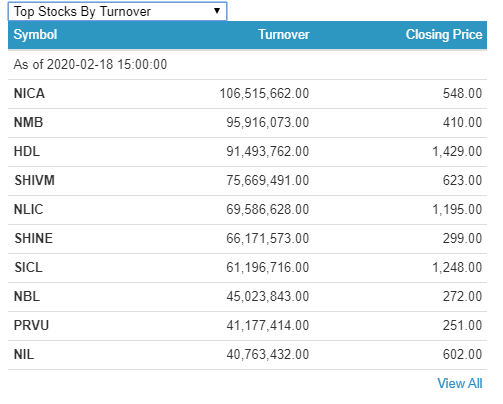 त्यस्तै, एनएमबि बैंक र हिमालयन डिस्टीलरीको ९ करोडमाथिको कारोबार भएको छ । सिवम् सिमेन्टको ७ करोड ५६ लाख रुपैयाँको कारोबार भएको छ । नेपाल लाइफ, साइन रेसुङगा डेभलपमेन्ट बैंक र शिखर इन्स्योरेन्सको ६ करोडमाथिको कारोबार भएको छ ।