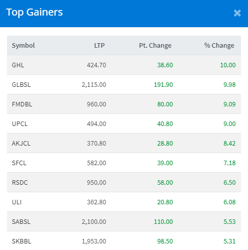 आज सबैभन्दा धेरै नेपाल हाइड्रो डेभलपर्सका लगानीकर्ताले गुमाएका छन् । कम्पनीका लगानीकर्ताले ५ दशमलव ३३ प्रतिशतका दरले गुमाएका छन् । यूनाइटेड इदी मर्दीका लगानीकर्ताले ५ दशमलव ०७ प्रतिशतका दरले गुमाएका छन् ।