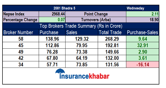 १८ अर्ब ९० करोड कारोबार भएको दिन ब्रोकर नम्बर ५८ बाट सर्वाधिक रकमको कारोबार भएको छ । ब्रोकर नम्बर ५८ बाट २ अर्ब ६८ करोड २९ लाखको कारोबार भएको छ जसमा १ अर्ब ३८ करोड ९६ लाखको खरीद छ भने १ अर्ब २९ करोड ३२ लाखको विक्री छ ।