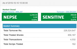 नेप्से परिसूचक साताको चौथो दिन ० दशमलव ४० अङ्कले बढेर १२१८ दशमलव ३३ अङ्कमा बन्द भएको छ । कारोबार रकम २२ करोड ६५ लाख रुपैयाँ पुगेको छ ।