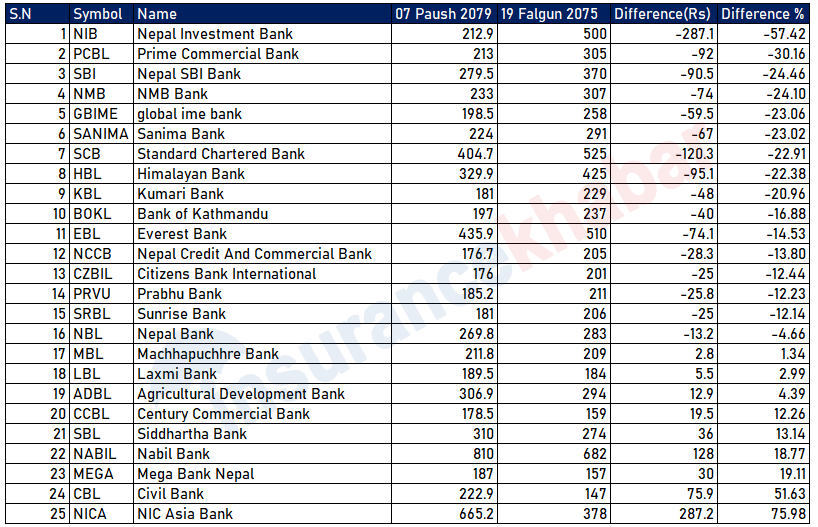 नेप्से ११०० हुदाँ भन्दा अहिले अधिकांश वाणिज्य बैंकको मूल्य कम, कुन बैंक कति सस्तोमा ?
