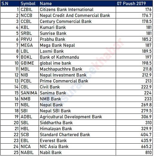 २५ वाणिज्य बैंक मध्ये अहिले १० वाणिज्य बैंकको बजार मूल्य २०० मुनी रहेको छ । सिटिजन्स बैंकको बजार मूल्य सबै भन्दा कम १७६ रुपैयाँ रहेको छ भने दोश्रोमा सबै भन्दा सस्तो नेपाल क्रेडिट एण्ड कमर्स बैंक रहेको छ । बैंकको शेयर मूल्य १७६ रुपैयाँ ७० पैसा रहेको छ । सबै भन्दा धेरै मूल्य भएको वाणिज्य बैंकमा नबिल बैंक रहेको छ । बैंकको बजार मुल्य ८१० रहेको छ । त्यस्तै विगत २ आर्थिक वर्ष देखि लाभांश नदिएको एनआईसी एशिया बैंकको बजार मूल्य ६६५ रुपैयाँ २० पैसा रहेको छ ।