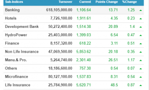 सबै भन्दा धेरै बैंकिङ क्षेत्रको परिसुचकमा वृद्धि आएको छ ।बैंक क्षेत्रको परिसुचकमा १ दशमलव २५ प्रतिशतले वृद्धि भएको हो ।सबै भन्दा धेरै एनएमबि बैंकको ७ करोड १४ लाख बराबरको शेयर किनबेच भयो ।