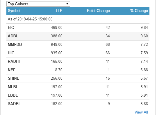 सबैभन्दा धेरै एभरेष्ट इन्स्योरेन्सको सेयरमा ९ दशमलव ८४ प्रतिशतको वृद्धि देखियो भने सबै भन्दा धेरै तारागोन रेजेन्सी होटल शेयर ९ दशमलव ३० प्रतिशतले घट्न पुग्यो ।