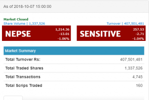 नेप्से परिसूचक साताको पहिलो दिन १३ दशमलव ०१ अङ्कले घटेर १२१४ दशमलव ३६ अङ्कमा बन्द भएको छ । कारोबार रकम ४० करोड ७५ लाख रुपैयाँ पुगेको छ ।