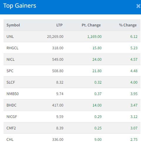 आज सबैभन्दा धेरै यूनिलिभर नेपालका लगानीकर्ताले कमाएका छन् । आज यस कम्पनीका लगानीकर्ताले ६ दशमलव १२ प्रतिशतका दरले कमाएका छन् । राप्ती हाइड्रोका लगानीकर्ताले ५ दशमलव २३ प्रतिशतका दरले कमाएका छन् । नेपाल इन्स्योरेन्स कम्पनीका लगानीकर्ताले ४ दशमलव ५७ प्रतिशतका दरले कमाएका छन् ।