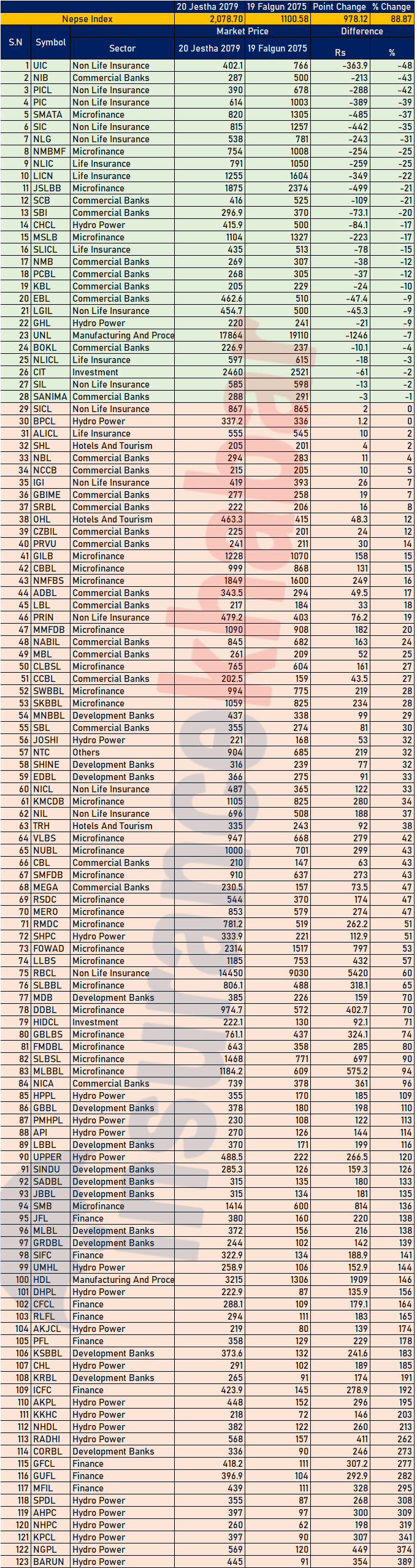 हाल जेष्ठ २० गते नेप्से परिसूचक २०७८ दशमवल ७० विन्दुमा बन्द भएको छ । परिसूचक यस अघिको बियरको न्यून विन्दु ११०० भन्दा करिव ८८ प्रतिशत माथि छ तर पनि केही कम्पनीको शेयर मूल्य भने ११०० विन्दु हुँदाको बेला भन्दा पनि तल आएको देखिएको छ । फागुन १९, २०७५ मा नेप्से अघिल्लो वियर चक्रको न्यून विन्दु ११०० दशमवल ५८ मा बन्द भएको थियो ।