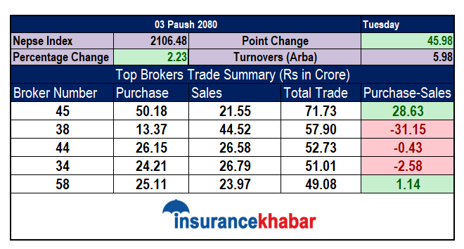 त्यस्तै दोस्रोमा ब्रोकर नं. ३८ रहेको छ। यो ब्रोकरबाट १३ करोड ३७ लाख रुपैयाँको शेयर खरिद हुँदा ४४ करोड ५२ लाख रुपैयाँको शेयर बिक्री भएको छ।