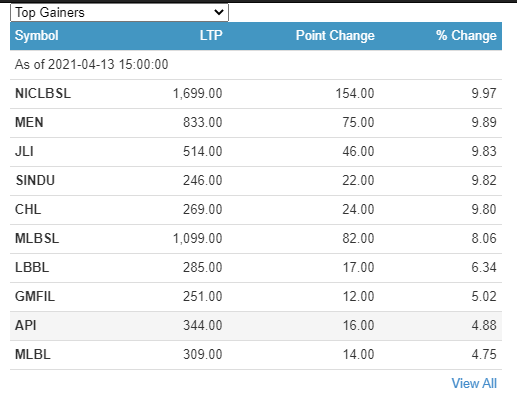 काठमाडौं । आज शेयर बजार नेप्से २३ दशमलव २३ अंकले बढेको छ । आज सबैभन्दा धेरै एनआइसी एशिया लघुवित्तका लगानीकर्ताले कमाएका छन् । कम्पनीका लगानीकर्ताले ९ दशमलव ९७ प्रतिशतका दरले कमाएका छन् । माउन्टेन इनर्जी नेपालका लागनीकर्ताले ९ दशमलव ८९ प्रतिशतका दरले कमाएका छन् ।