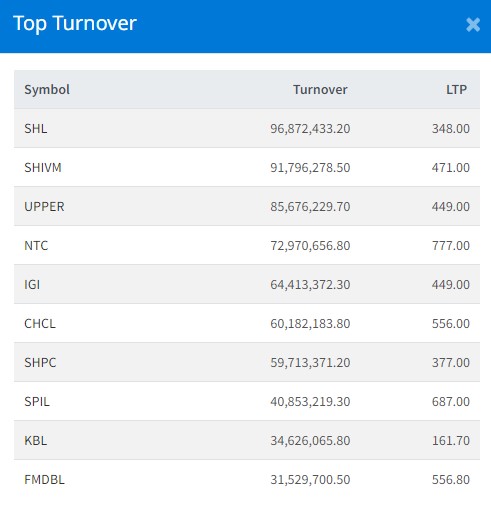 आज दिनभरिमा २६९ कम्पनीको ५५ लाख ४१ हजार ८७८ कित्ता शेयर किनबेच हुँदा १ अर्ब ९८ करोडमाथिको शेयर कारोबार भएको छ । आज सबैभन्दा धेरै सोल्टी होटलको शेयर कारोबार भएको छ । आज कम्पनीको ९ करोड ६८ लाख रुपैयाँको शेयर कारोबार भएको छ । शिवम् सिमेन्टको ९ करोड १७ लाख रुपैयाँको शेयर कारोबार भएको छ । अपर तामाकोशीको ८ करोड ५६ लाख रुपैयाँको शेयर कारोबार भएको छ ।