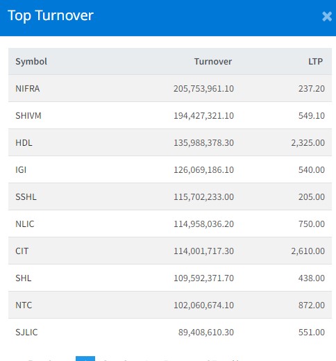 आज दिनभरिमा २६८ कम्पनीको १ करोड ७ लाख ९२ हजार कित्ता शेयर किनबेच हुँदा ४ अर्ब ११ करोडमाथिको शेयर कारोबार भएको छ । आज सबैभन्दा धेरै निफ्राको शेयर कारोबार भएको छ । आज कम्पनीको २० करोड ५७ लाख रुपैयाँ शेयर कारोबार भएको छ । शिवम् सिमेन्टको १९ करोड ४४ लाख रुपैयाँको शेयर कारोबार भएको छ । हिमालयन डिष्टिलरीको १३ करोड ५९ लाख रुपैयाँको शेयर कारोबार भएको छ ।