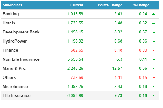 फाइनान्स र अन्य क्षेत्रको परिसुचक बाहेक अरु सबै क्षेत्रको परिसुचकमा वृद्धि आएको छ । उत्पादनमूक क्षेत्रको परिसुचमा ० दशमलव ५६ प्रतिशतको वृद्धि आएको छ ।सबैभन्दा धेरै छिमेक लघुवित्त विकास बैंकको ५ करोड ८६ लाख बराबरको शेयर किनबेच भयो । सबै भन्दा धेरै भार्गव विकास बैंकको सेयरमा ५ दशमलव ९७ प्रतिशतको वृद्धि देखियो भने सबै भन्दा हाथवे फाइनान्सको शेयर ३ दशमलव २ प्रतिशतले घट्न पुग्यो ।