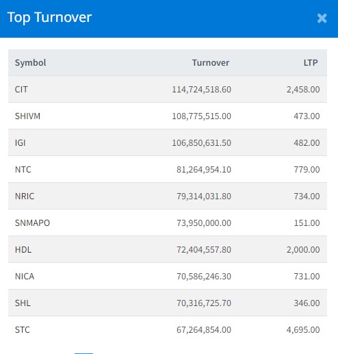 आज २७५ कम्पनीको ९५ लाख २८ हजार २५५ कित्ता शेयर किनबेच हुँदा ३ अर्ब ४५ करोडको शेयर कारोबार भएको छ । आज सबैभन्दा धेरै नागसरक लगानी कोषको शेयर कारोबार भएको छ । कम्पनीको ११ करोड ४७ लाख रुपैयाँको शेयर कारोबार भएको छ । शिवम् सिमेन्टको १० करोड ८७ लाख रुपैयाँको शेयर कारोबार भएको छ । आइजिआइ प्रुडेन्सियलको १० करोड ६८ लाख रुपैयाँको शेयर कारोबार भएको छ ।