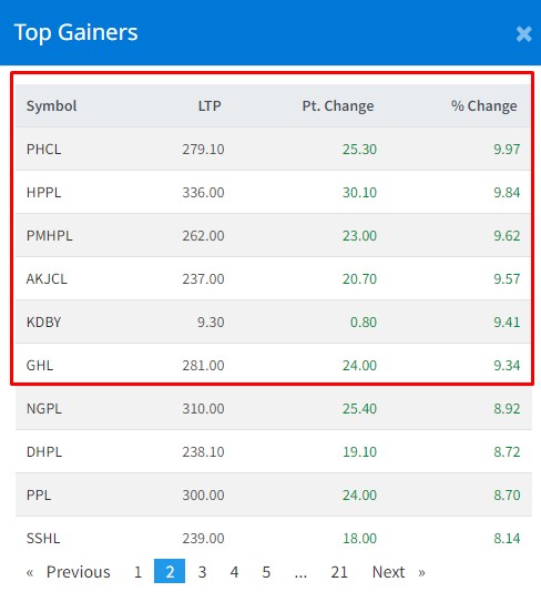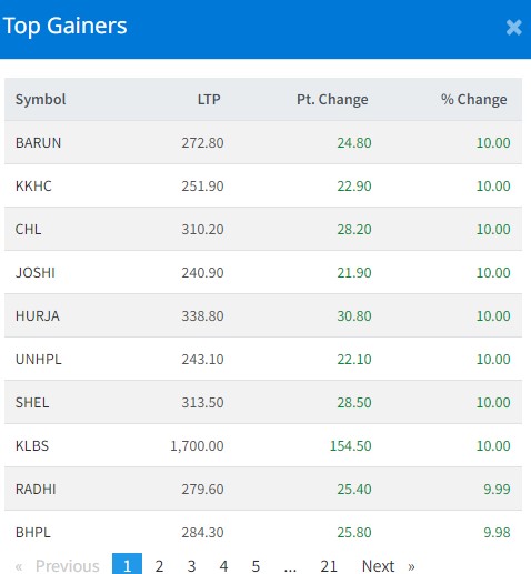 आज बरुण हाइड्रोपावर, खानीखोला हाइड्रोपावर, छ्याङदी हाइड्रो, जोशी, हिमालयन उर्जा विकास, यूनियन हाइड्रो, सिङगटी हाइड्रोका लगानीकर्ताले १० प्रतिशतका दरले कमाएका छन् ।