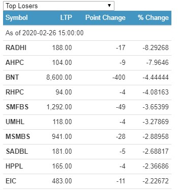 आज राधी विद्युत कम्पनीका लगानीकर्ताले सबैभन्दा धेरै ८ प्रतिशतका दरले गुमाएका छन् । अरुण भ्याली हाइड्रोपावर कम्पनी, बोटलर्स नेपाल, राधी हाइड्रोपावर, स्वाभिमान लघुवित्त, यूनाइटेड मोदी हाइड्रोपावर लगायतका कम्पनीलेृ गुमाएका छन् ।