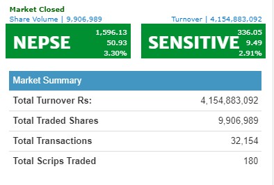 आज दिनभरिमा १ सय ८० कम्पनीको ९९ लाख ६ हजार कित्ता शेयर किनबेच हुँदा ४ अर्ब १५ करोड ४८ लाख ८३ हजार रुपैयाँको कारोबार भएको छ । सबैभन्दा धेरै नेपाल लाइफ इन्स्योरेन्सको २१ करोड ९९ लाख रुपैयाँमाथिको कारोेबार भएको छ ।