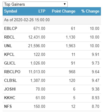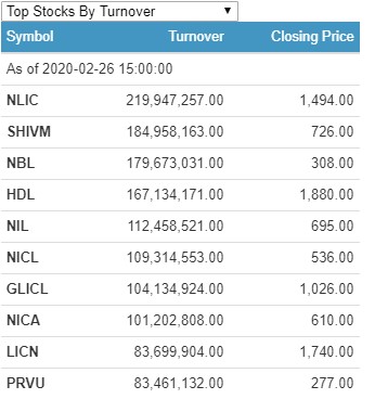 शिवम् सिमेन्टको १८ करोडमाथिको कारोबार भएको छ । नेपाल बैंकको १७ करोडमाथिको कारोबार भएको छ । हिमालयन डिस्टीलरीको १६ करोड ७१ लाख रुपैयाँको कारोबार भएको छ । नेको इन्स्योरेन्सको ११ करोड २४ लाख रुपैयाँ, नेपाल इन्स्योरेन्स, गुँरास लाइफ इन्स्योरेन्स र एनआइसी एशिया बैंकको १० करोडमाथिको कारोबार भएको छ ।