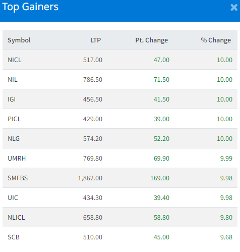 आज बजार बढ्दा ५ कम्पनीका लगानीकर्ताले १० प्रतिशतका दरले कमाएका छन् भने ५ कम्पनीका लगानीकर्ताले ९ प्रतिशतका दरले कमाएका छन् । नेपाल इन्स्योरेन्स कम्पनी, नेको इन्स्योरेन्स कम्पनी, आइएमई जनरल, प्रुडेन्सियल र एनएलजी इन्स्योरेन्स कम्पनीका लगानीकर्ताले १० प्रतिशतका दरले कमाएका छन् ।
