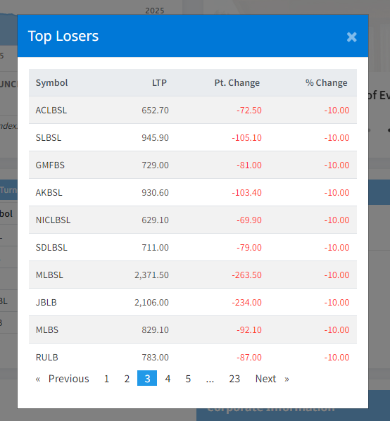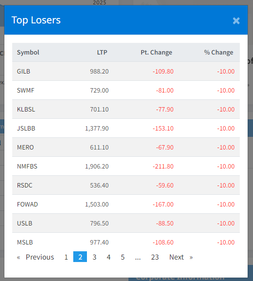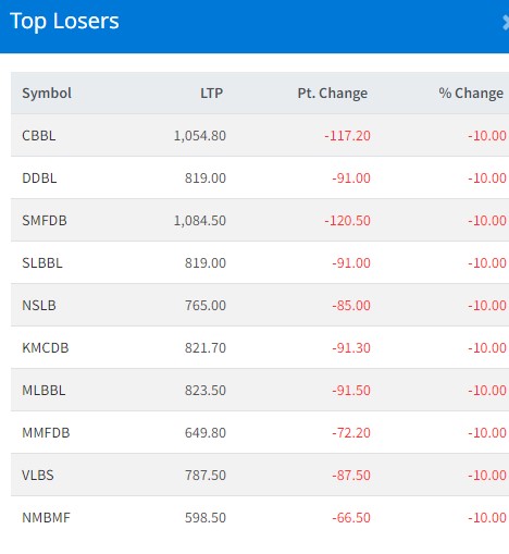आज ४४ कम्पनीको शेयर मुल्यमा नकारात्मक सर्किट लागेको छ । आज छिमेक लघुवित्त, डिप्रोक्स लघुवित्त, समिट लघुवित्त, स्वरोजगार लघुवित्त लगायतका कम्पनीको शेयर मुल्य घटेको छ ।