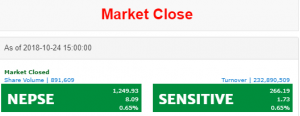 नेप्से परिसूचक साताको चौथो दिन ८ दशमलव ०९ अङ्कले बढेर १२४९ दशमलव ९३ अङ्कमा बन्द भएको छ । कारोबार रकम २३ करोड २८ लाख रुपैयाँ पुगेको छ ।
