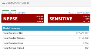 नेप्से परिसूचक साताको दोस्रो दिन ८ दशमलव १० अङ्कले घटेर १२१० दशमलव ८८ अङ्कमा बन्द भएको छ । कारोबार रकम २७ करोड ७४ लाख पुगेको छ ।