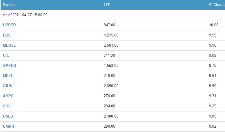 त्यस्तै, आज सबैभन्दा अपर तामाकोशीका लगानीकर्ताले १० प्रतिशतका दरले कमाएका छन् । विशाल बजार कम्पनीका लगानीकर्ताले ९ दशमलव ९९ प्रतिशतका दरले कमाएका छन् ।