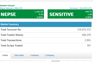 नेप्से परिसूचक साताको पाचौँ दिन ९ दशमलव ३९ अङ्कले बढेर ११८१ दशमलव ६९ अङ्कमा बन्द भएको छ । कारोबार रकम २१ करोड ९ लाख पुगेको छ ।