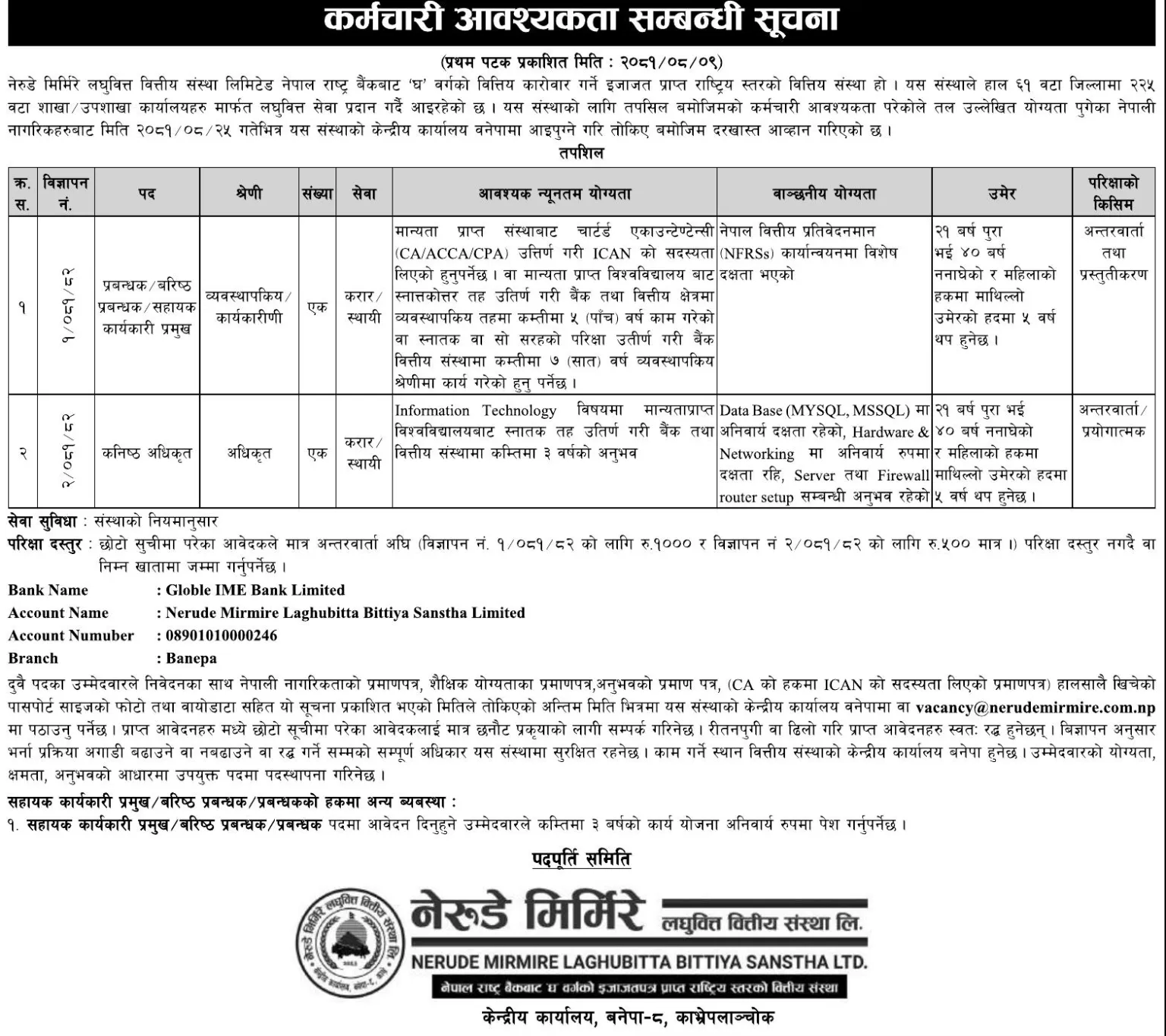 उक्त पदहरुमा आवेदन दिनको लागि मान्यताप्राप्त विश्वविद्यालयबाट स्नातकदेखि चार्टड एकाउन्टेन्सी उत्तिर्ण गरि आइसीइएएनको सदस्यता लिएको हुनुपर्ने जनाइएको छ । इच्छुक तथा योग्यता पुगेका उम्मेदवारले कम्पनीको केन्द्रिय कार्यालय बनेपा वा वेबसाइट मार्फत आवेदन दिन सक्नेछन् ।