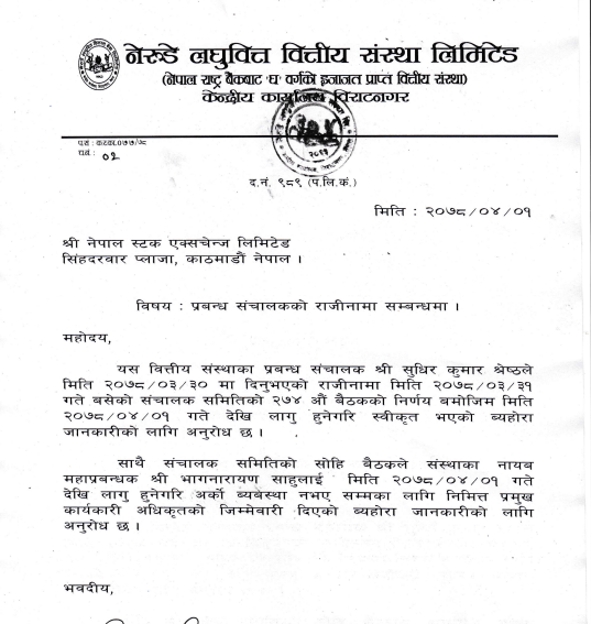 काठमाडौं । नेरुडे लघुवित्त वित्तीय संस्थाको प्रबन्धक सञ्चालक सुधिर कमार श्रेष्ठले राजिनामा दिएका छन् । संस्थाको हिजो बसेको सञ्चालक समितिको बैठकले उनले दिएको राजिनामा आज असार १ गतेदेखि लागू हुने गरी स्वीकृत गरेको छ ।