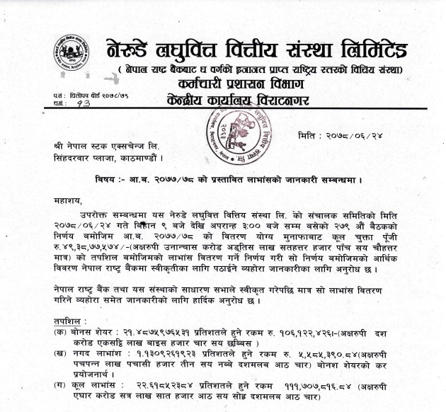 काठमाडौं । नेरुडे लघुवित्तले लाभांश प्रस्ताव गरेको छ । कम्पनीको हिजो आइतबार बसेको संचालक समितिको बैठकले आर्थिक वर्ष ७७/७८ को मुनाफाबाट लाभांश बितरण गर्ने प्रस्ताव गरेको हो ।