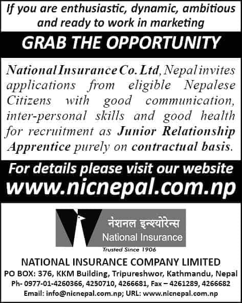 काठमाडौं । नेशनल इन्स्योरेन्स कम्पनीले कर्मचारीको माग गरेको छ । कम्पनीले जूनियर रिलेशनसिपका लागि कर्मचारीको माग गरेको जनाएको छ । ईच्छुक तथा योग्यता पुगेकाले कार्यालयमा सम्पर्क गर्न सकिनेछ ।