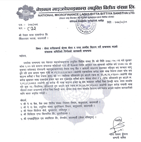 उक्त प्रस्तावित लाभांश नेपाल राष्ट्र बैंकको स्वीकृति पश्चात कम्पनीको आगामी साधारण सभाले पारित गरेपछि लगानीकर्ताले पाउनेछन् ।