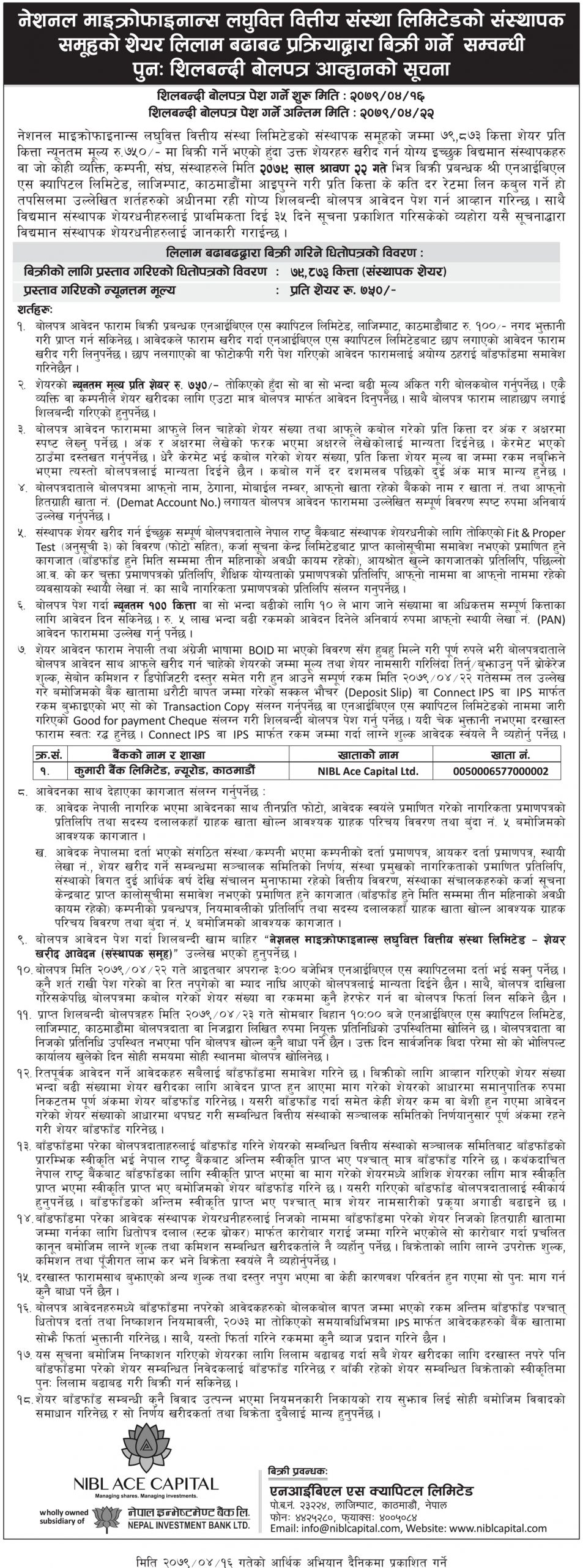 उक्त शेयर खरीद गर्न इच्छुक विद्यमान संस्थापक वा व्यक्ति, कम्पनी तथा संस्थाले साउन २२ गतेसम्म एनआईबिएल एस क्यापिटल, लाजिम्पाट, काठमाडौंमा आइपुग्ने गरी बोलपत्र पेश गर्न सक्नेछन् ।