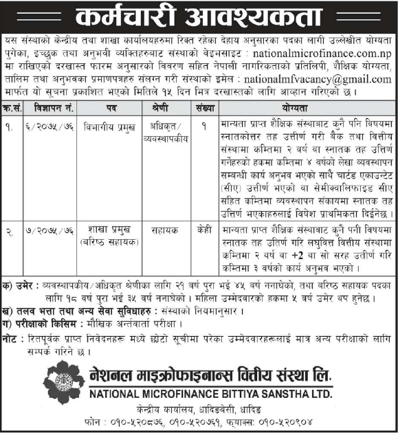 नेशनल माइक्रोफाइनान्सले विभिन्न पदका लागि कर्मचारी आह्वान गरेको छ । संस्थाले विभागीय प्रमुख पदका का लागि १ जना र शाखा प्रमुख पदका लागि केही कर्मचारीको माग गरेको छ ।