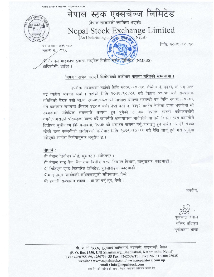 काठमाडौं । नेपाल स्टक एक्सचेञ्जले नेशनल माइक्रोफाइनान्स लघुवित्त वित्तीय संस्था लिमिटेडको शेयर कारोबार फुकुवा गरेको छ । संस्थाले गत आर्थिक वर्ष २०७८/७९ को लाभांश सम्बन्धि पत्र नेप्सेमा कारोबार समयमा उपलब्ध गराएको कारण नेप्सेले धितोपत्र सूचीकरण विनियमावली बमोजिम स्पष्टिकरण माग गर्दै शेयर कारोबार रोक्का गरेको थियो ।