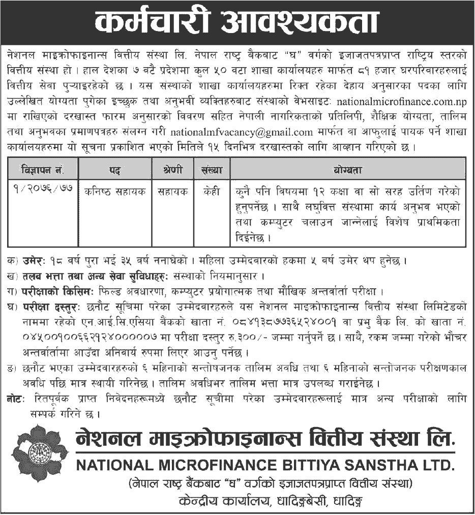 काठमाडौँ । नेशनल माइक्रोफाइनान्स वित्तीय संस्था लिमिटेडले कर्मचरी माग गरेको छ । संस्थाले कनिष्ठ सहायक पदका केही संख्यामा कर्मचारी माग गरेको हो ।