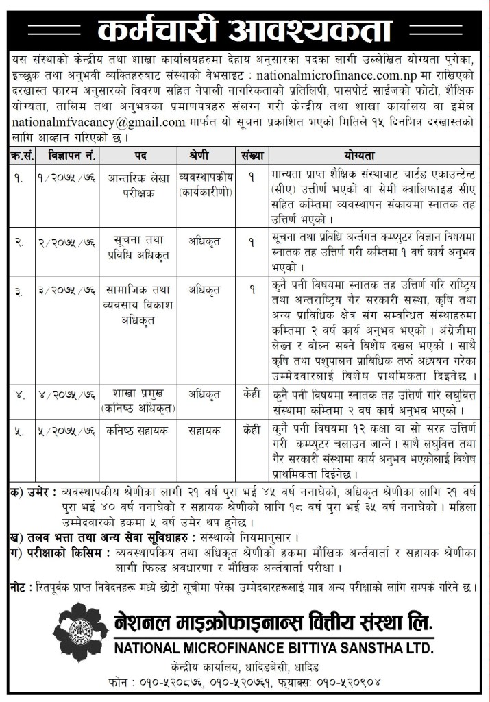 नेशनल माईक्रोफाइनान्स वित्तीय संस्था लिमिटेडले केन्द्रीय तथा शाखा कार्यालयहरुका लागि विभिन्न कर्मचारी माग गरेको छ ।