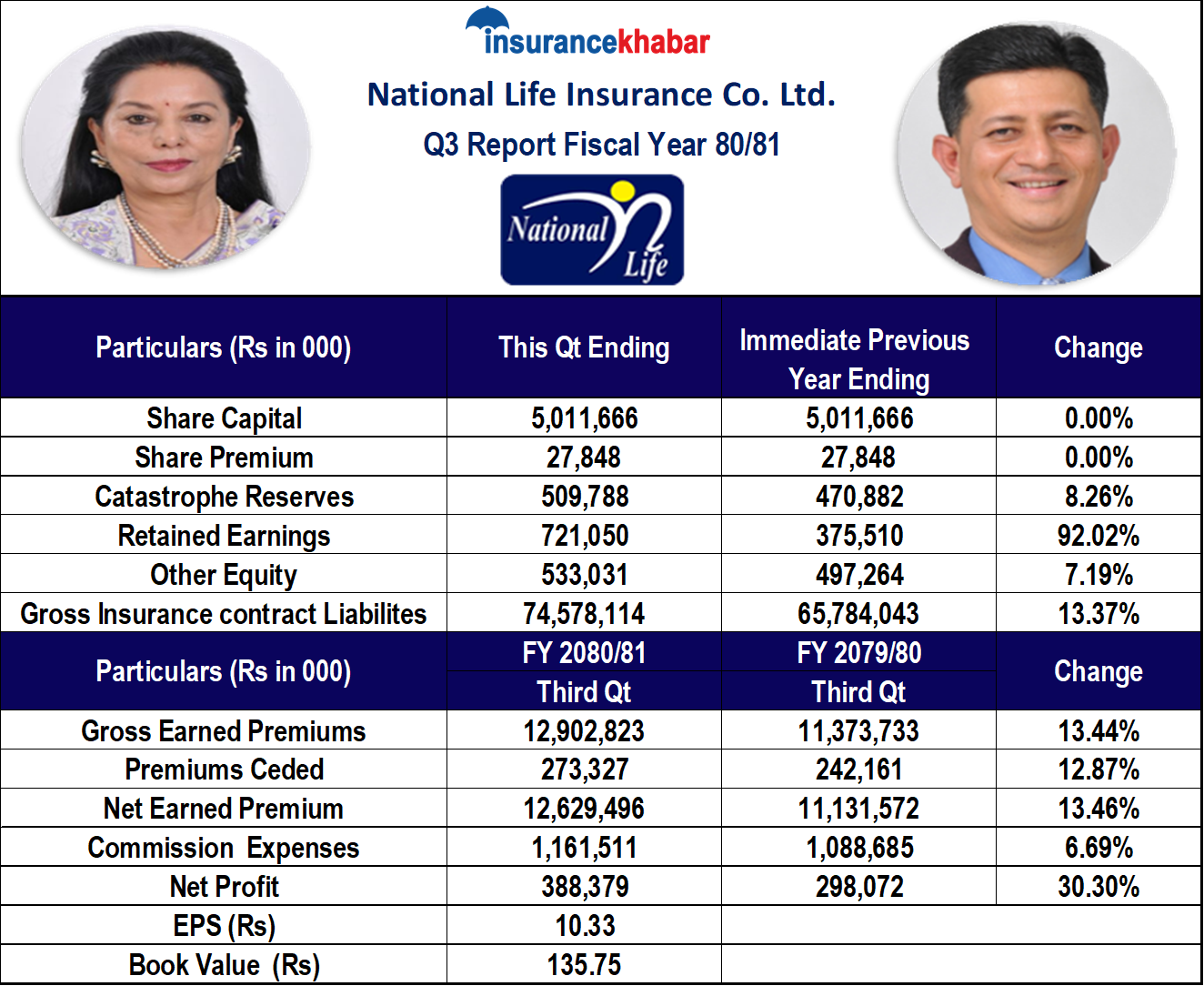 काठमाडौं । नेशनल लाइफ इन्स्योरेन्स कम्पनीले चालु आर्थिक वर्ष २०८०।८१ को तेस्रो त्रैमाससम्मको अपरिष्कृत वित्तीय विवरण सार्वजनिक गरेको छ। शेयरपुँजी ५ अर्ब १ करोड भएको नेशनल लाइफले चालु आर्थिक वर्षको तेस्रो त्रैमाससम्म ३८ करोड ८३ लाख रुपैयाँ खुद नाफा आर्जन गरेको छ। अघिल्लो आर्थिक वर्षको सोही अवधिसम्म कम्पनीले २९ करोड ८० लाख रुपैयाँ नाफा आर्जन गरेको थियो। अघिल्लो आर्थिक वर्षको सोही अवधिको तुलनामा कम्पनीको नाफा ३०.३० प्रतिशतले बढेको छ।