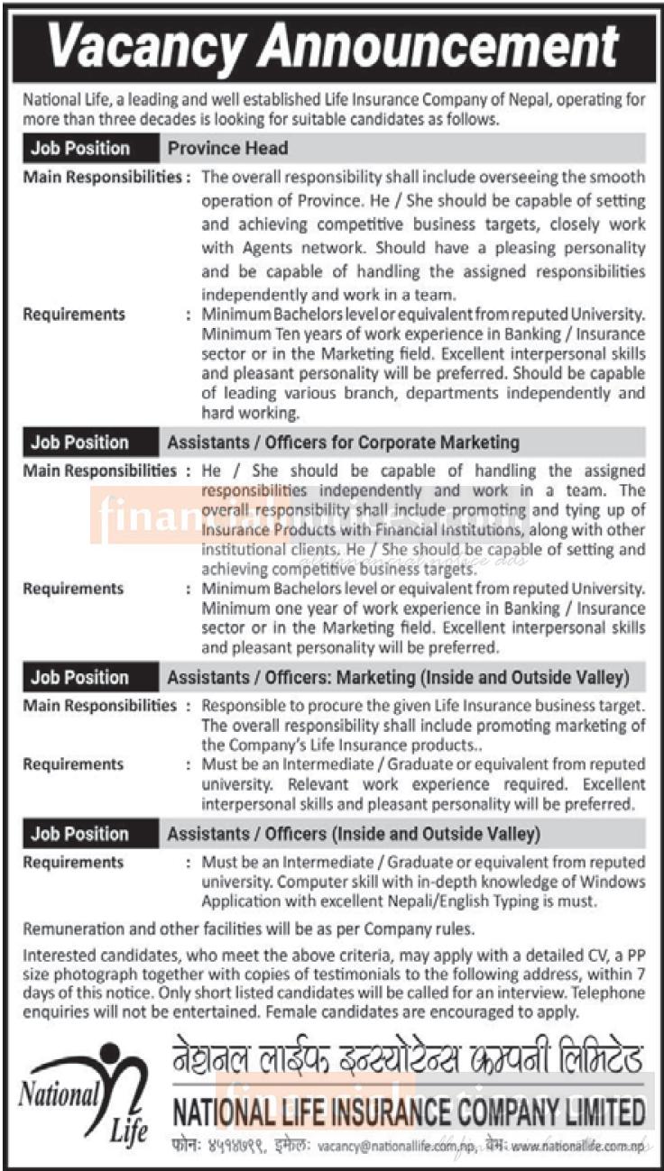 काठमाडौं । नेशनल लाइफ इन्स्योरेन्सले विभिन्न पदहरुका लागि कर्मचारी माग गरेको छ । कम्पनीले प्रोभिन्स हेडका लागि केही, असिस्ट्यान्ट फर कर्पोरेट मार्केटिङका लागि केही, असिस्ट्यान्ट मार्केटिङ तथा असिस्ट्यान्ट अफिसर पदका लागि केही संख्यामा कर्मचारी माग गरेको छ