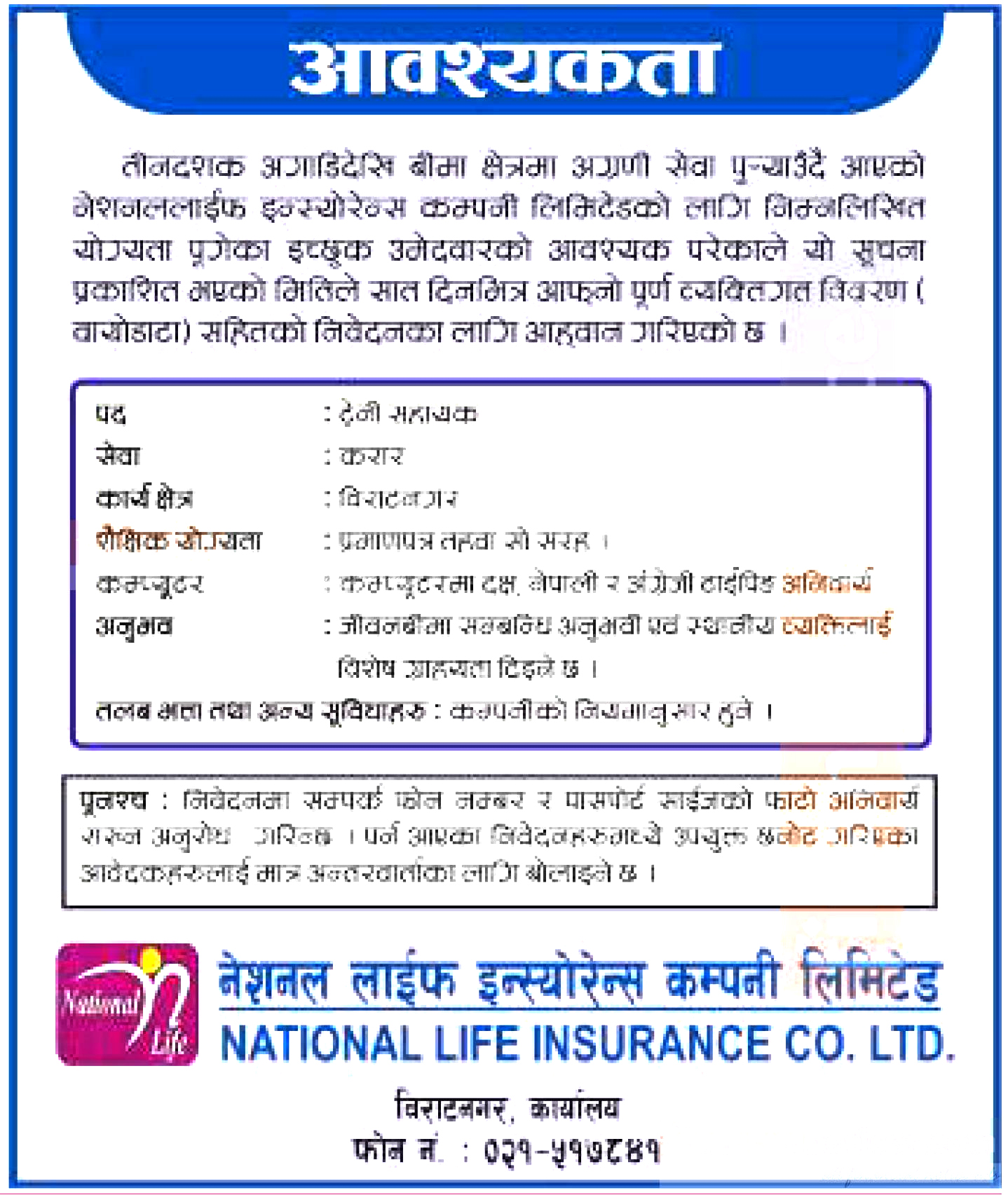 काठमाडौं । नेशनल लाइफ इन्स्योरेन्स कम्पनी लिमिटेडले कर्मचारी माग गरेको छ । कम्पनीले ट्रेनी सहायक पदका लागि र्मचारी माग गरेको हो । उक्त पदमा आवेदन दिनको लागि प्रमाणपत्र तह वा सो सरह उत्तिर्ण गरेको हुनुपर्ने छ । उक्त पदमा आवेदन दिन ईच्छुक उम्मेदवारले सुचना प्रकाशित मितिले ७ दिन भित्र आवेदन दिनुपर्नेछ ।