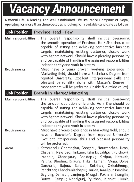काठमाडौं । नेशनल लाइफ इन्स्योरेन्स कम्पनीले विभिन्न पदका लागि कर्मचारीको माग गरेको छ । कम्पनीले प्रोभिन्स हेडका लागि केही, ब्रान्च ईन्चार्च र मार्केटिङका लागि केही, ट्रेनी असिस्टेन्टका लागि केही कर्मचारीको माग गरेको छ ।